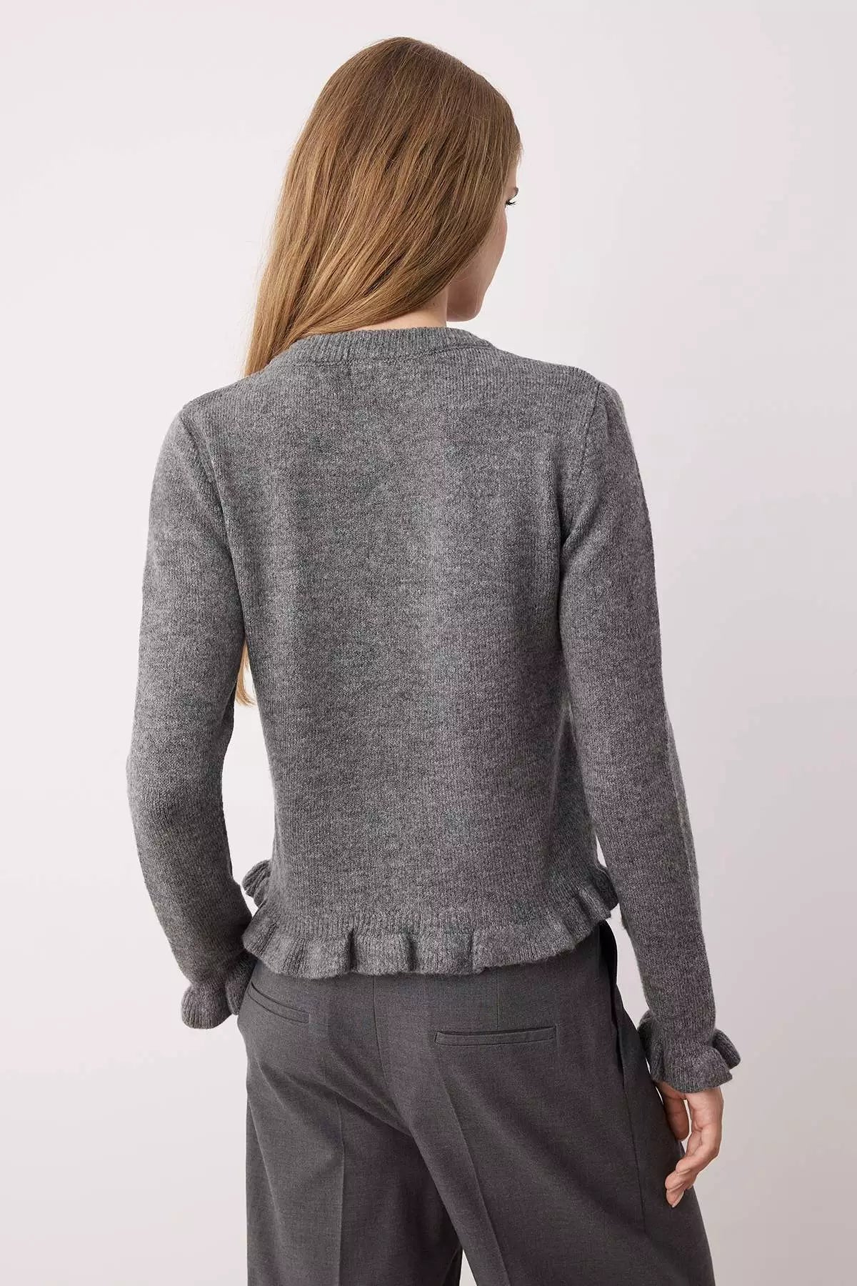 The Bravenza Sweater Shirt is a soft, feminine knit with a clean, cropped shape and delicate ruffle trims that add just the right touch of charm. Finished with a high neckline, button-front detail, and subtle frilled edges at the hem and cuffs, it pairs beautifully with skirts or high-waisted denim for an elevated everyday look.