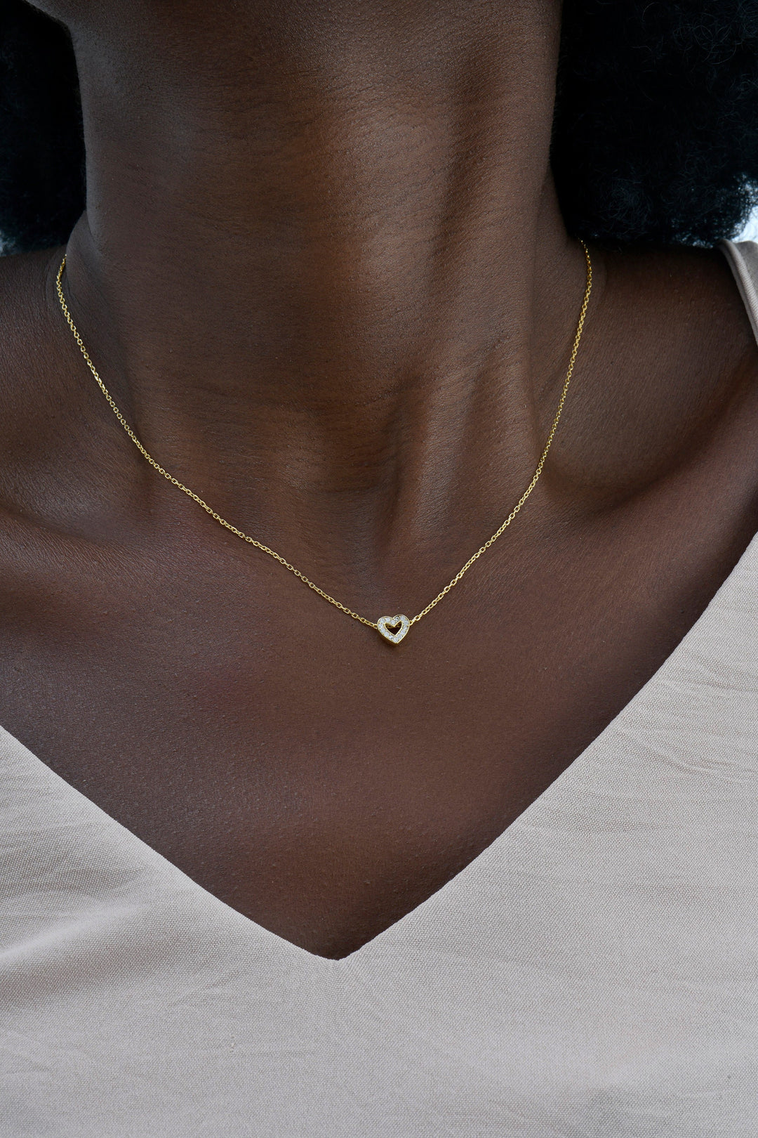 Sweet and radiant, the Amorelle Necklace features a petite open-heart charm outlined in sparkling stones. A graceful symbol of love, it rests gently on a delicate gold chain, perfect for everyday romance.